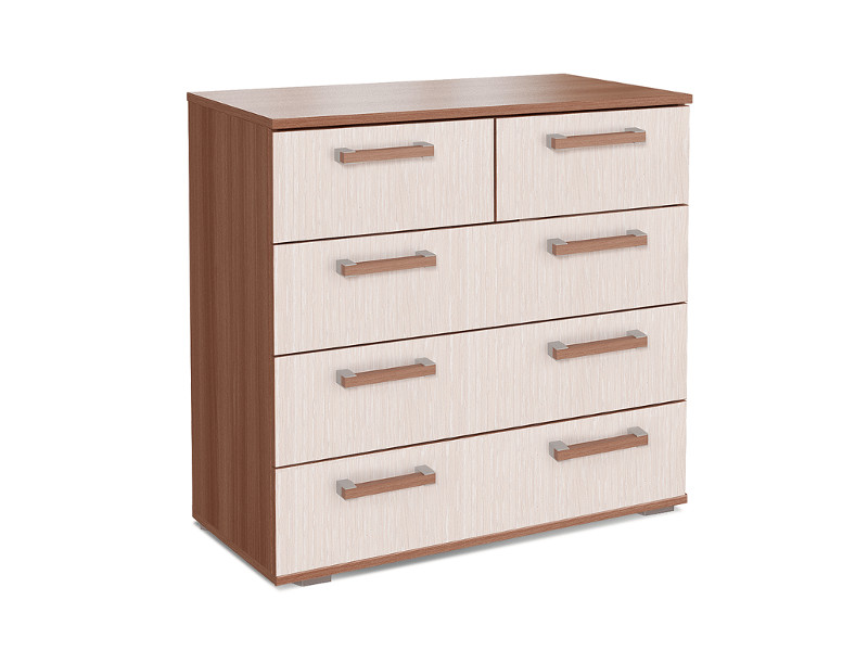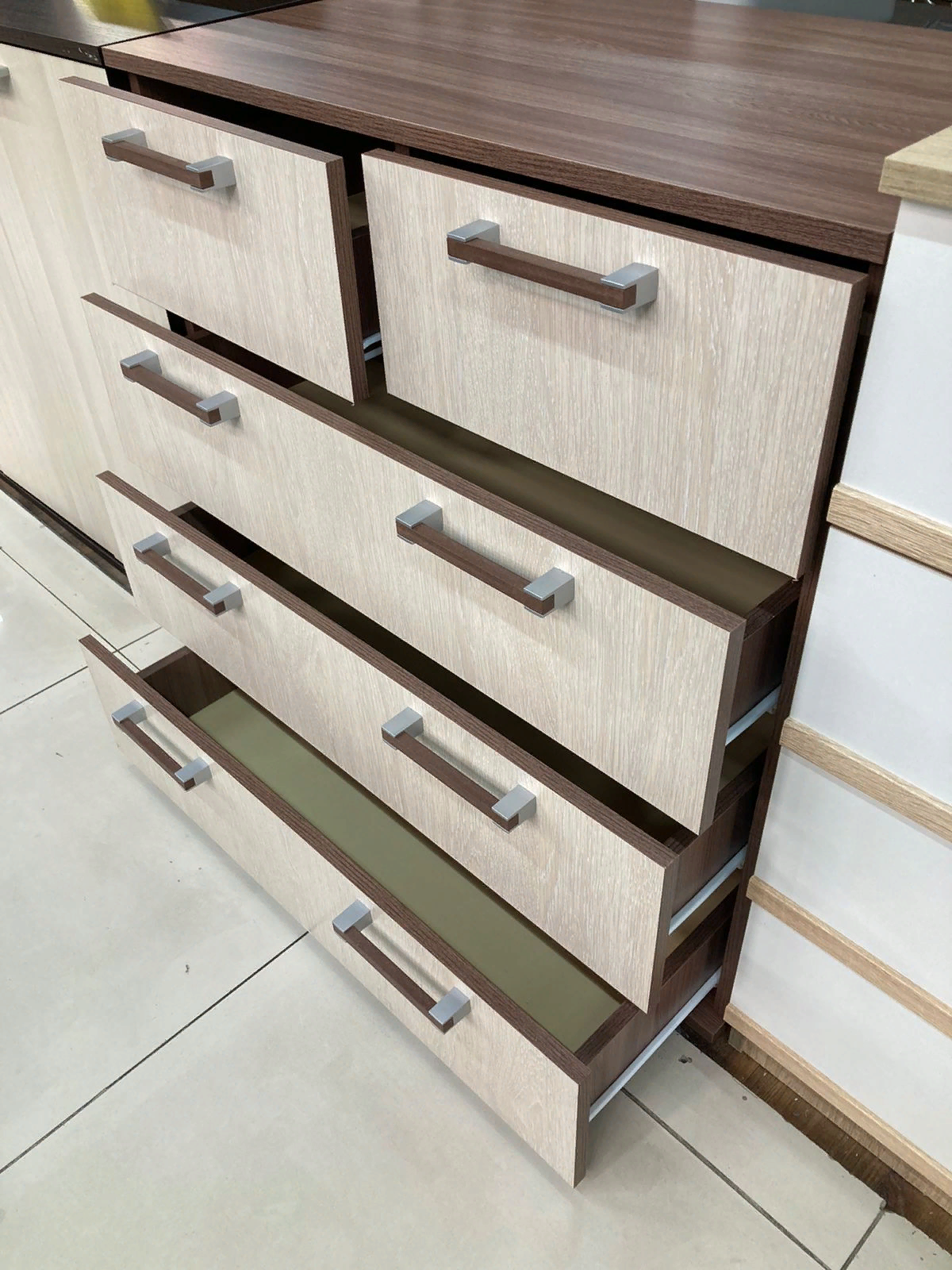 Комплектация: Комод оснащен пятью просторными ящиками, которые идеально подходят для хранения одежды, постельного белья и других необходимых вещей. Ящики имеют плавный механизм открывания и закрывания, что обеспечивает удобство в использовании.
