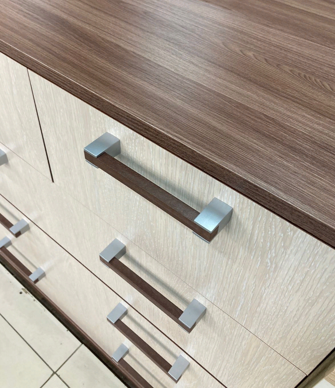 Материалы: Комод выполнен из качественного ДСП, имитирующего текстуру ясени шимо и дуба атланта. Эти материалы обеспечивают не только привлекательный внешний вид, но и долговечность.