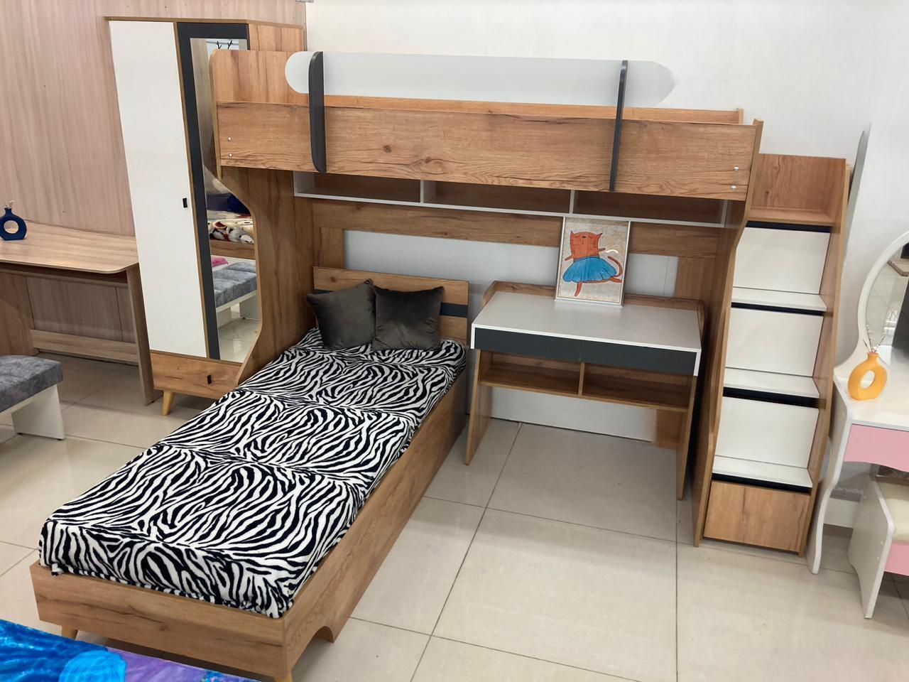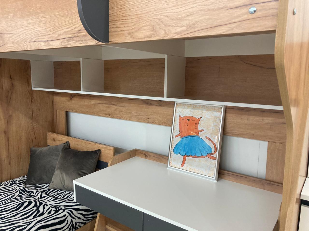 Кровать предлагает не только удобное место для сна, но и дополнительное пространство для игр и учебы. Под ней расположено место для стола или игровых элементов, что позволяет эффективно использовать каждый квадратный метр комнаты. Конструкция выполнена из качественных материалов, что обеспечивает долговечность и надежность.