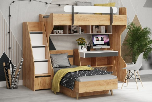 Кровать-чердак с уникальным дизайном, выполненная в сочетании дуба золотистого, антрацита и белого цвета, станет идеальным решением для комнаты вашего ребенка. Модель имеет размеры 800x2000 мм и идеально впишется в любое современное интерьерное оформление.