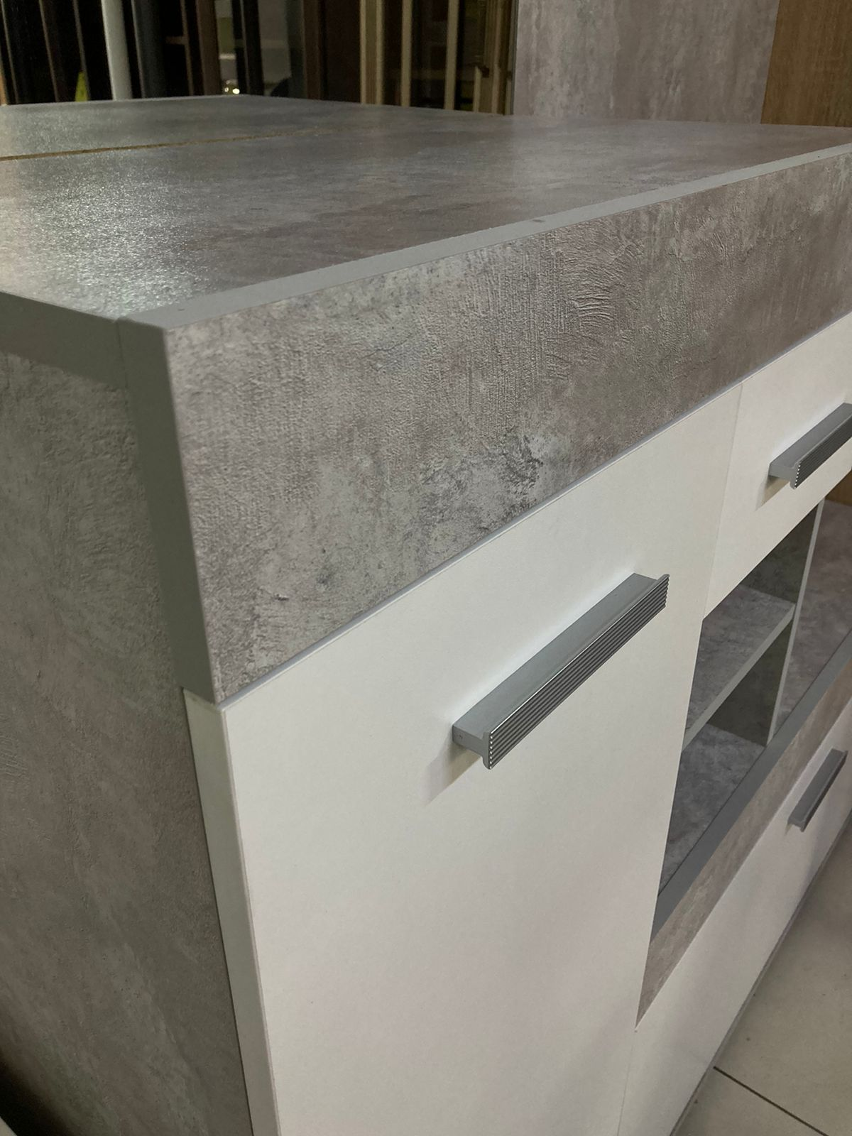 Материалы: Прихожая изготовлена из качественного МДФ с имитацией бетона, что обеспечивает долговечность и прочность. Белые элементы добавляют свежести и контраста, подчеркивая стиль и современность дизайна.