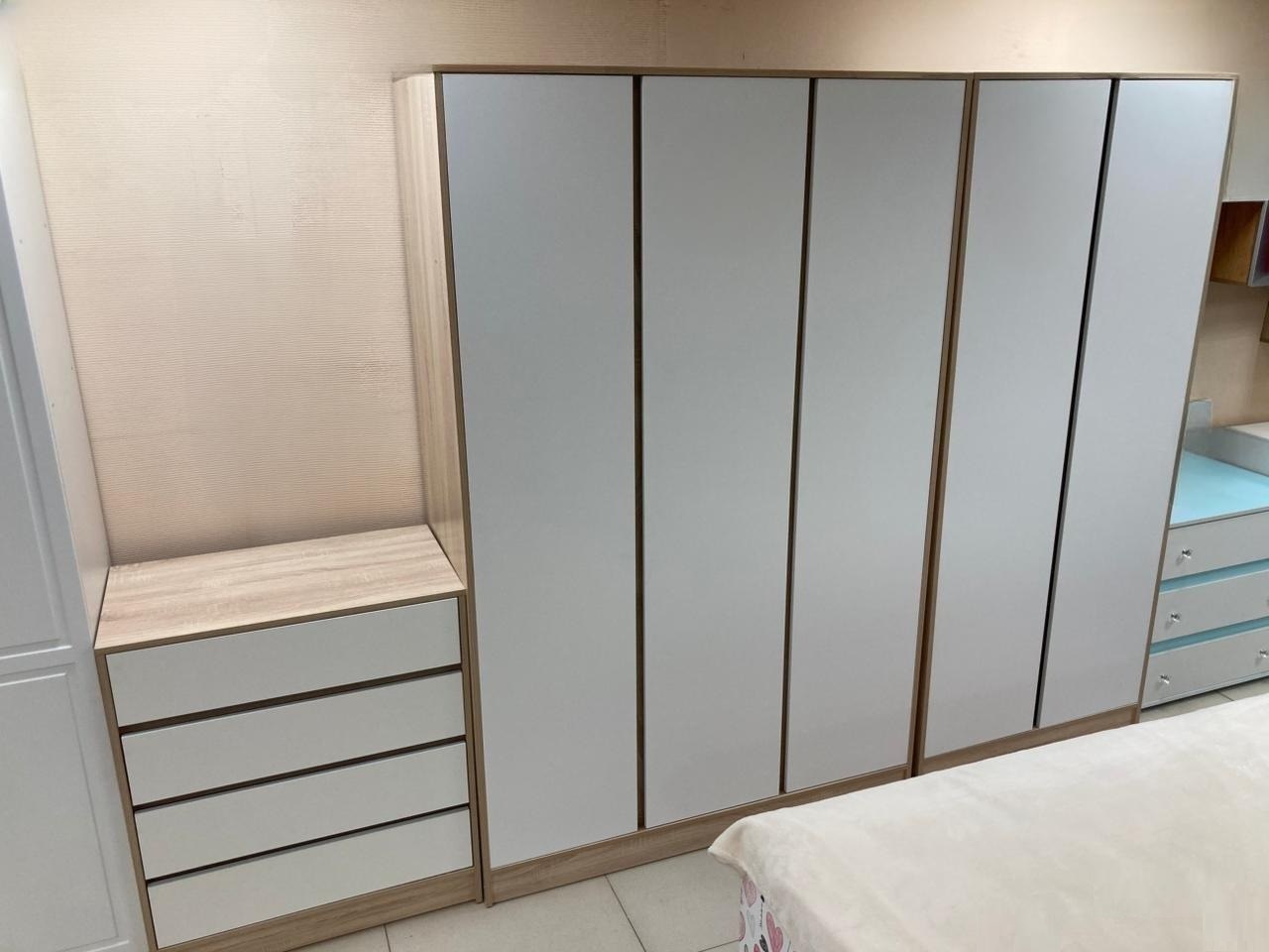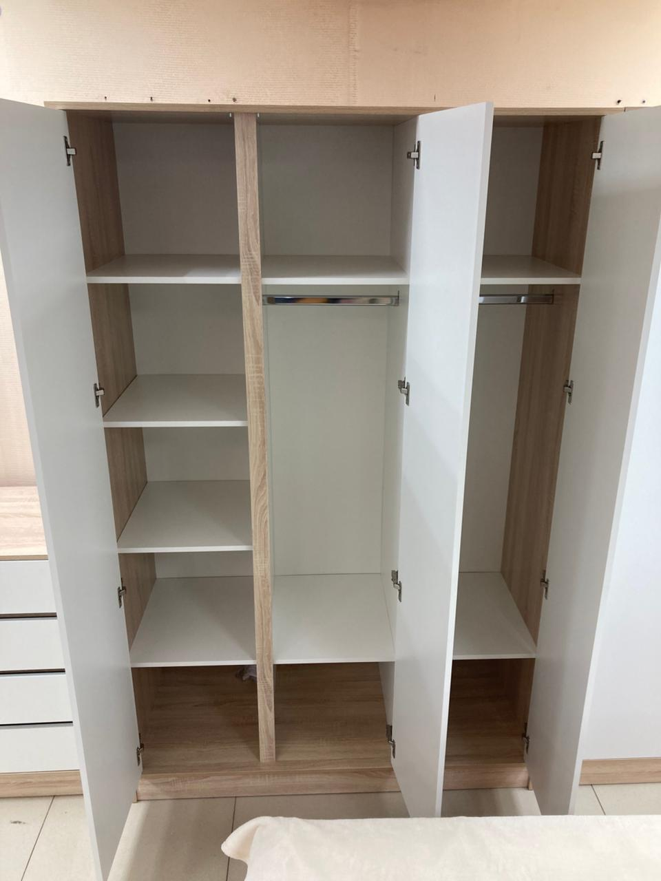 Ширина шкафа составляет 1341 мм, высота — 2100 мм, а глубина — 550 мм. Эти размеры позволяют разместить модель в ограниченном пространстве, не жертвуя при этом функциональностью. Внутреннее наполнение шкафа продумано для удобного хранения одежды и аксессуаров. Каждая секция предлагает достаточно места для одежды на вешалках и полок для обуви и других предметов.
