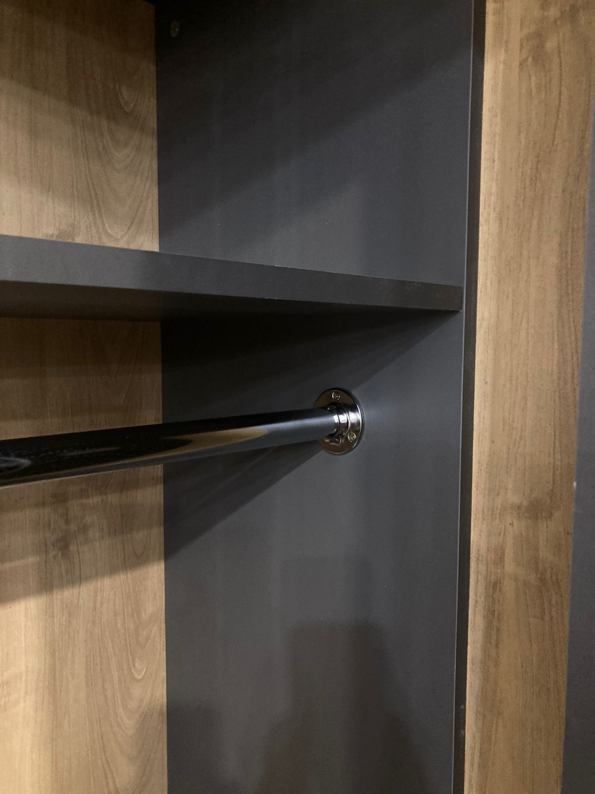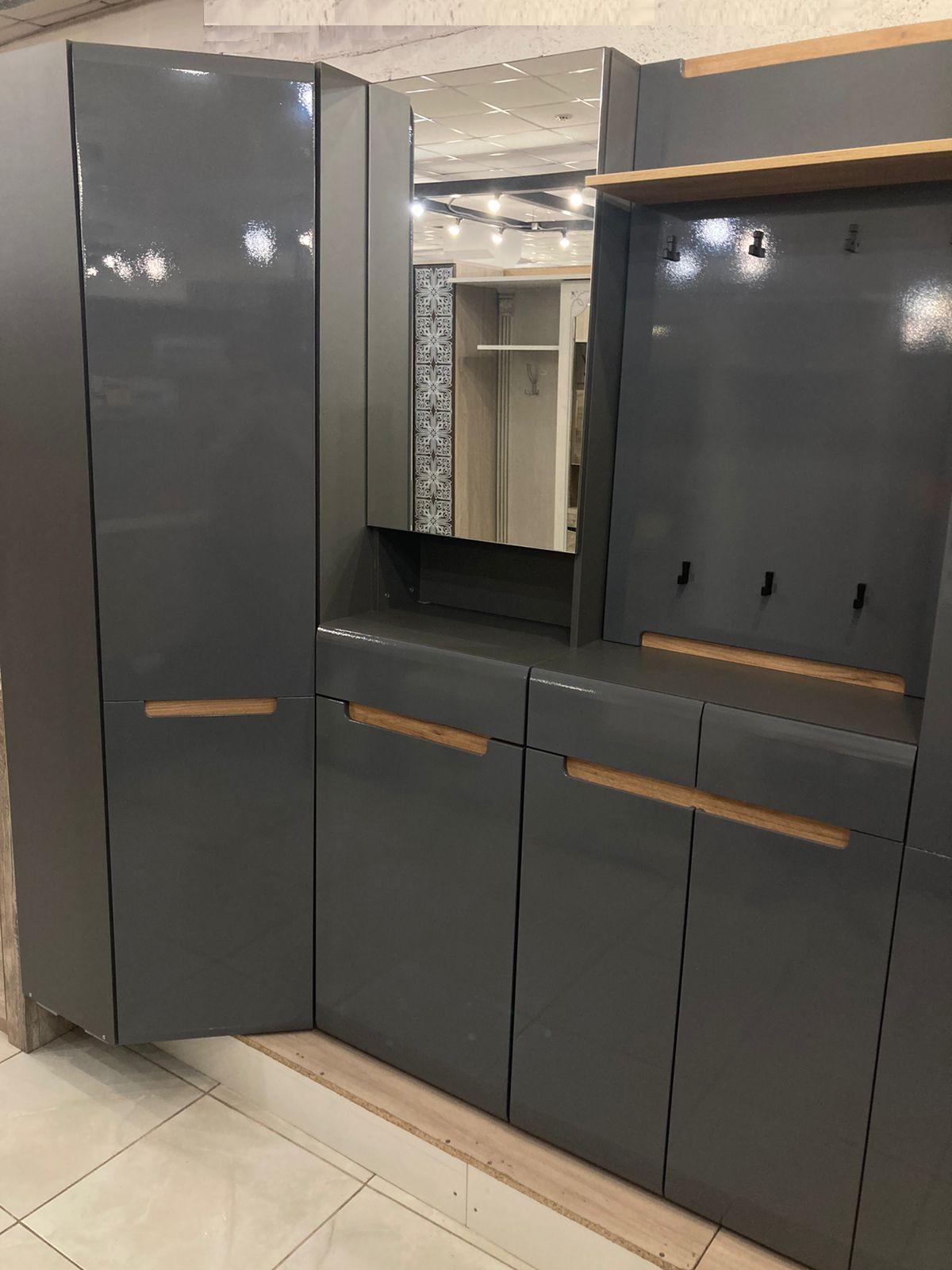 Шкаф выполнен в элегантной цветовой гамме серого графита, что придает ему современный и лаконичный вид. Гладкая глянцевая поверхность не только выглядит стильно, но и легко очищается от загрязнений. Материалы, использованные в производстве, обеспечивают долговечность и устойчивость к внешним воздействиям.