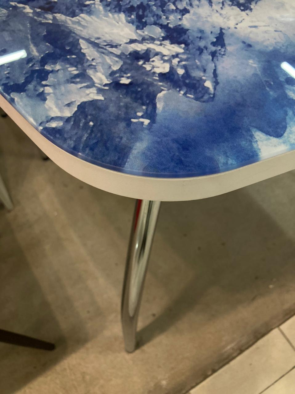 Нераздвижной стол Бочонок с подстольем Чайка в хроме и стеклом Абстракция 2 от фабрики ВВР