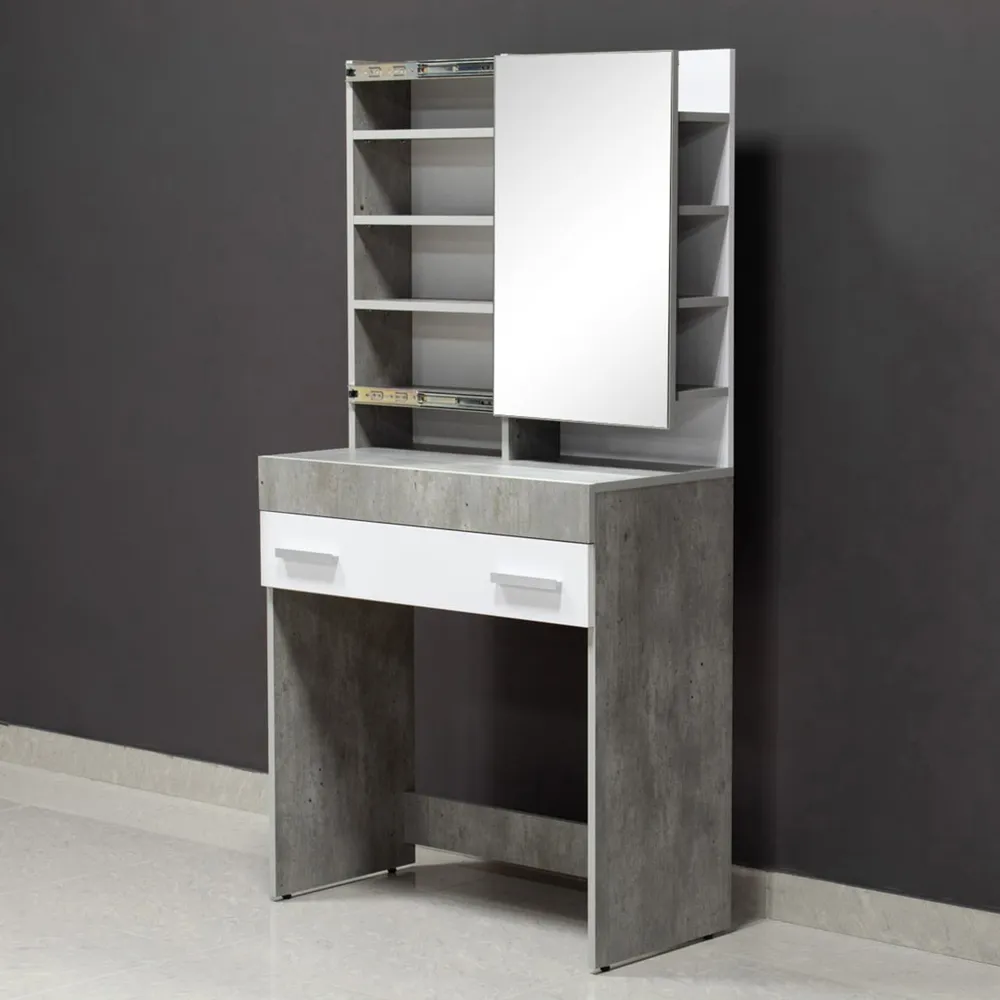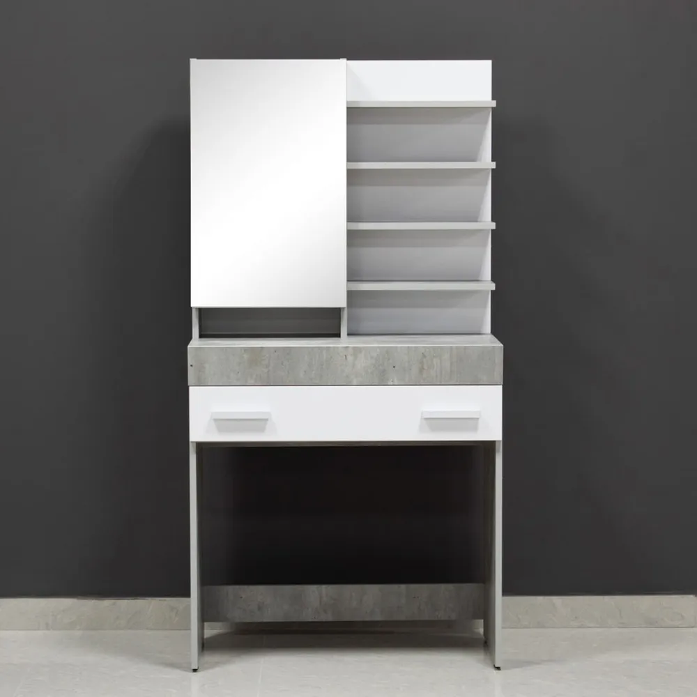 Туалетный столик Инстайл СТ-01 от фабрики БТС сочетает в себе лаконичный дизайн и практичность. Модель выполнена в популярной цветовой комбинации «бетон-белый», которая прекрасно впишется в интерьер спальни, придавая ей современный и стильный вид. Этот столик станет не только удобным местом для хранения косметики и аксессуаров, но и стильным акцентом вашей комнаты.