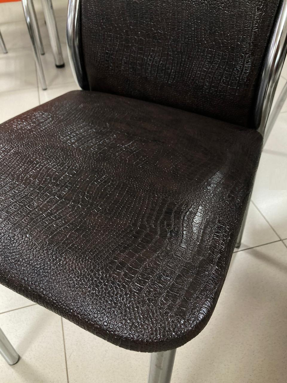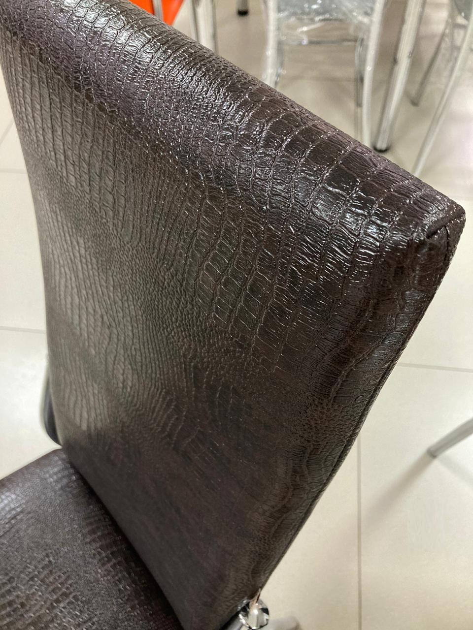 Стул выполнен из высококачественного экокожи в оттенке шоколадного крокодила, что придает ему уникальность и элегантность. Хромированная основа обеспечивает не только долговечность, но и легкость в уходе, придавая мебели современный вид.