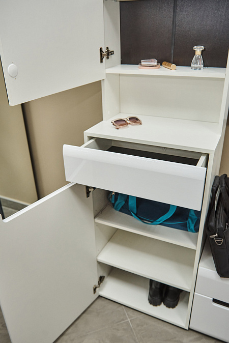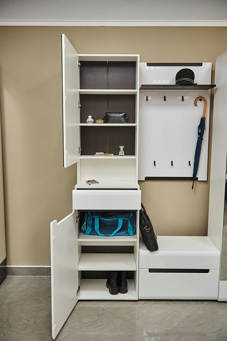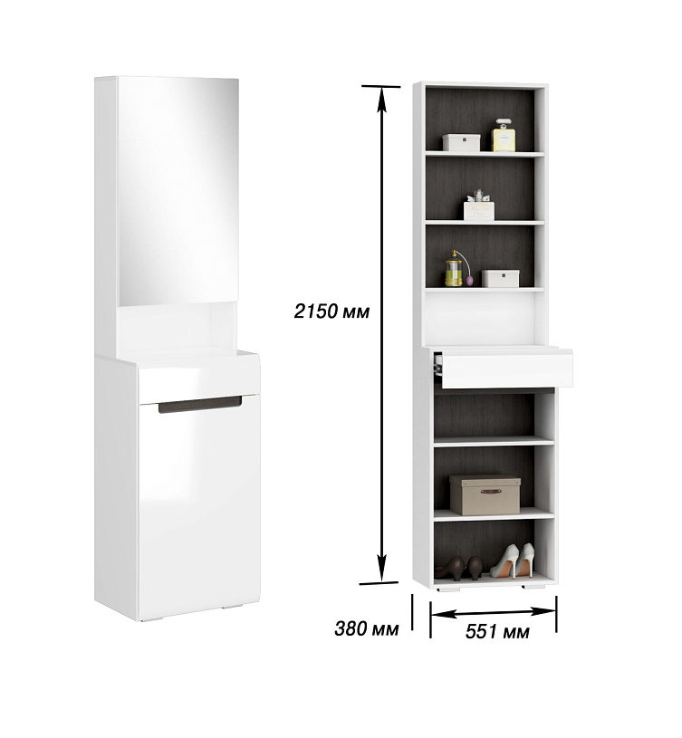 Размеры тумбы составляют: ширина — 551 мм, высота — 2150 мм и глубина — 380 мм. Эти параметры делают тумбу компактной, но в то же время достаточно вместительной