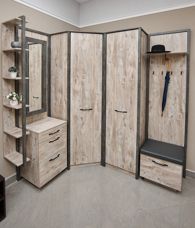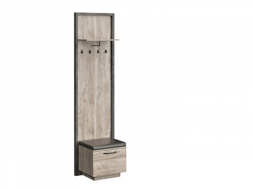 Элегантная вешалка с тумбой Клео в дубе Юкон и темном ателье с мягким элементом и фасадом из ЛДСП