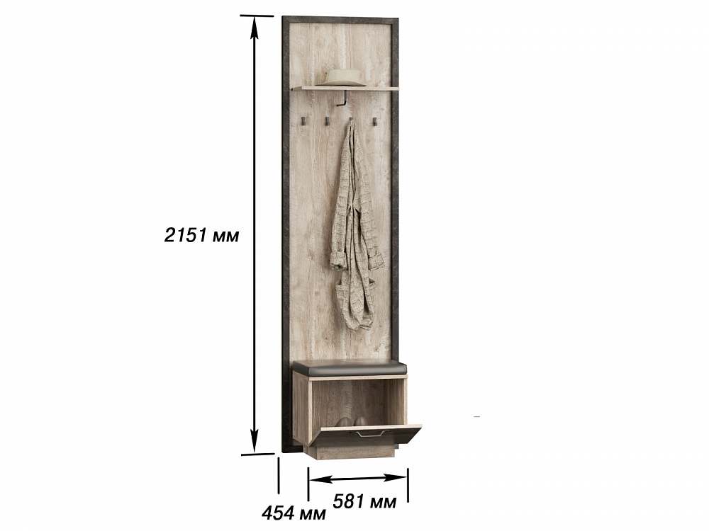 Размеры: Вешалка обладает компактными размерами, идеально подходящими для небольшой прихожей: ширина — 581 мм, высота — 2150 мм, глубина — 454 мм.